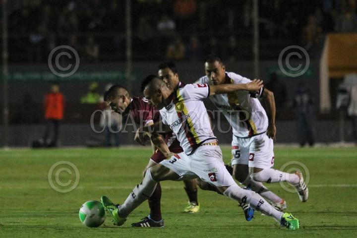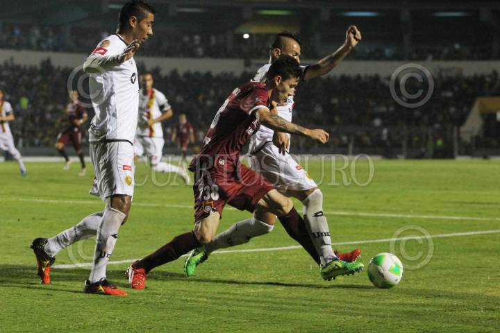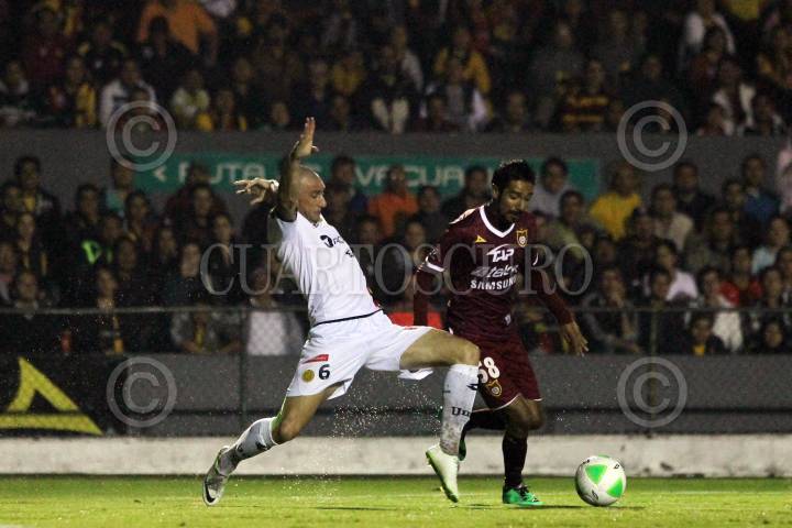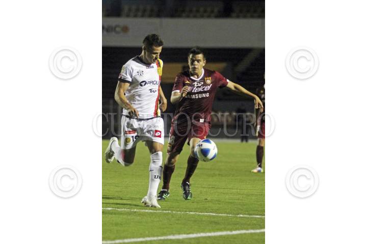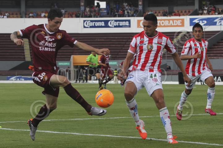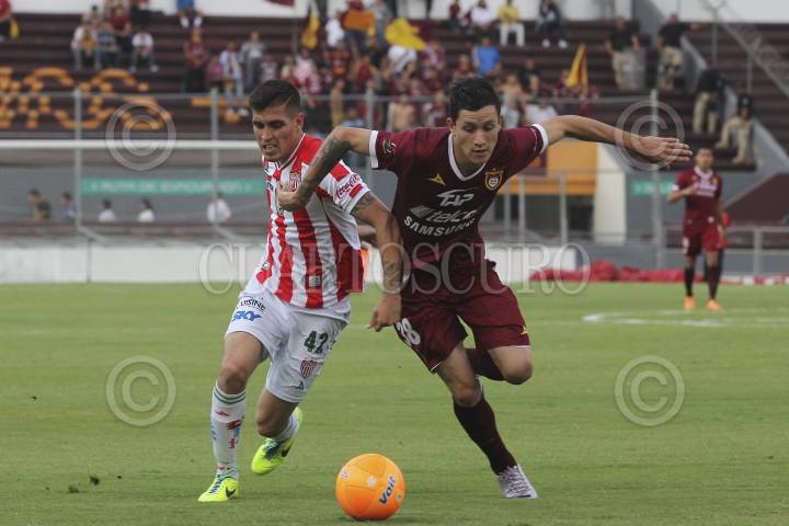 ZAPOPAN, JALISCO, 26ABRIL2014.- Esta noche en el Estadio 3 de Marzo y en partido correspondiente a las Semifinales de vuelta de la Liga de Ascenso MX 2014, se enfrentan los equipos de Estudiantes Tecos frente a los Rayos del Necaxa. En la imagen el jugador de Estudiantes Gustavo Ramírez, disputa un balón frente al contrario de Necaxa, Ventura Alvarado. FOTO: FERNANDO CARRANZA GARCIA /CUARTOSCURO.COM