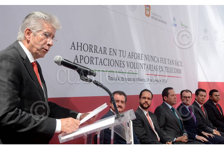 TOLUCA, EDOMEX, 19JUNIO2015.- El secretario de Comunicaciones y Transportes, Gerardo Ruiz Esparza, estuvo presente en el lanzamiento del programa “Ahorrar en tu Afore nunca fue tan fácil de Aportaciones Voluntarias Telecomm". FOTO: SCT /CUARTOSCURO.COM