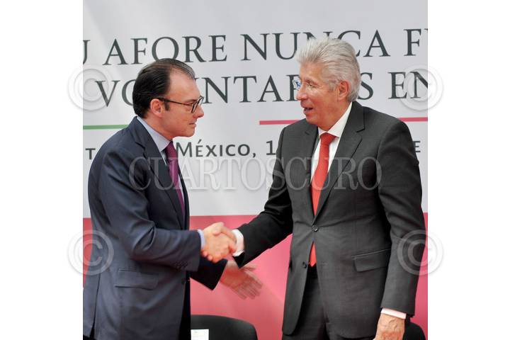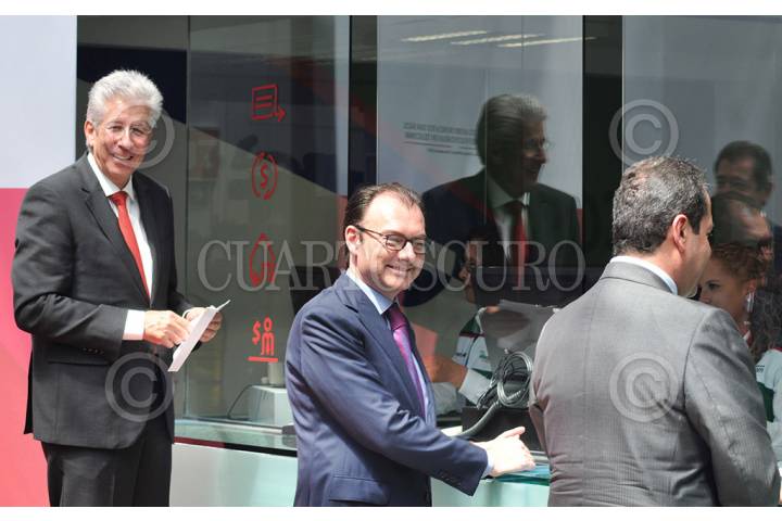 TOLUCA, EDOMEX, 19JUNIO205.- Luis Videgaray, secretario de Hacienda y Crédito Público y Gerardo Ruiz Esparza, secretario de Comunicaciones y Transportes, durante el lanzamiento del programa de Aportaciones Voluntarias Telecomm, ya que cuenta con la red de sucursales más extensas del país, sus más de mil 600 sucursales telegráficas permitirán acercar servicios financieros a todos los mexicanos. FOTO: SCT /CUARTOSCURO.COM