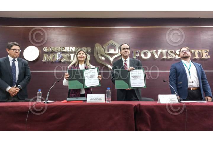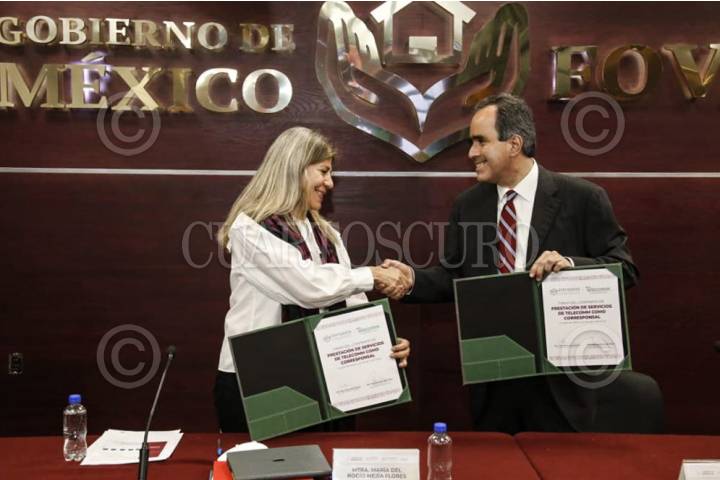 Rocío Mejía Flores, directora General de TELECOMM, y César Buenrostro Moreno Vocal Ejecutivo del Fondo, firmaron un convenio para que sus sucursales reciban pagos de los créditos hipotecarios de los derechohabientes del Fondo.