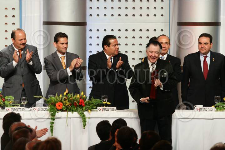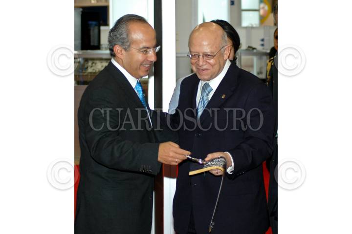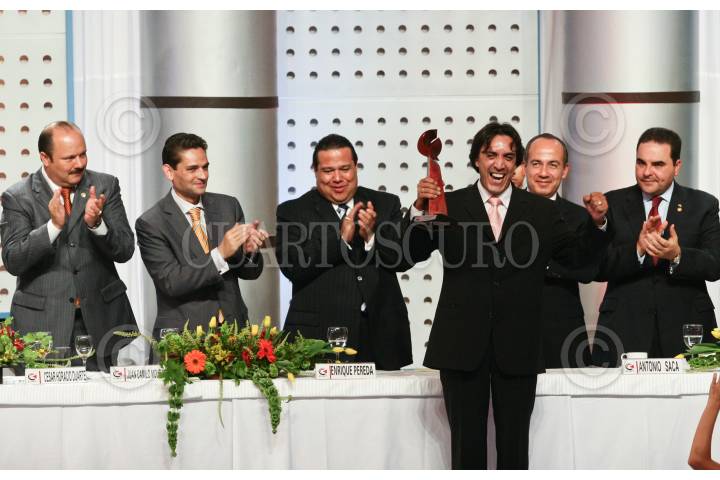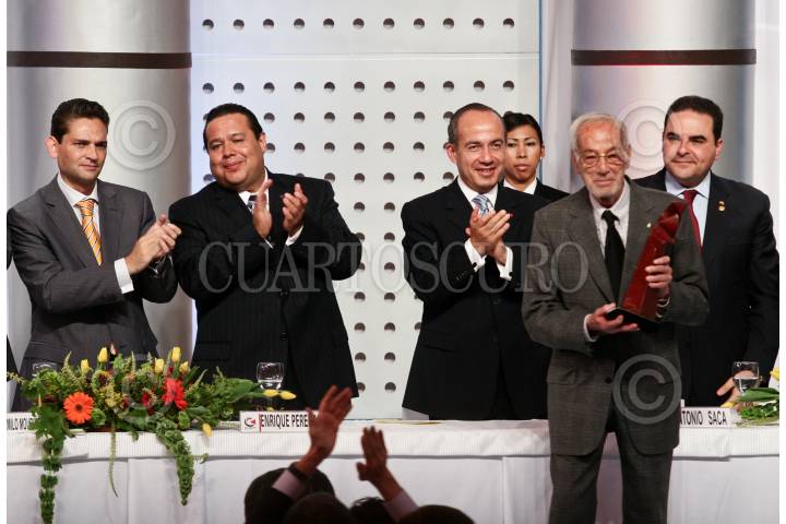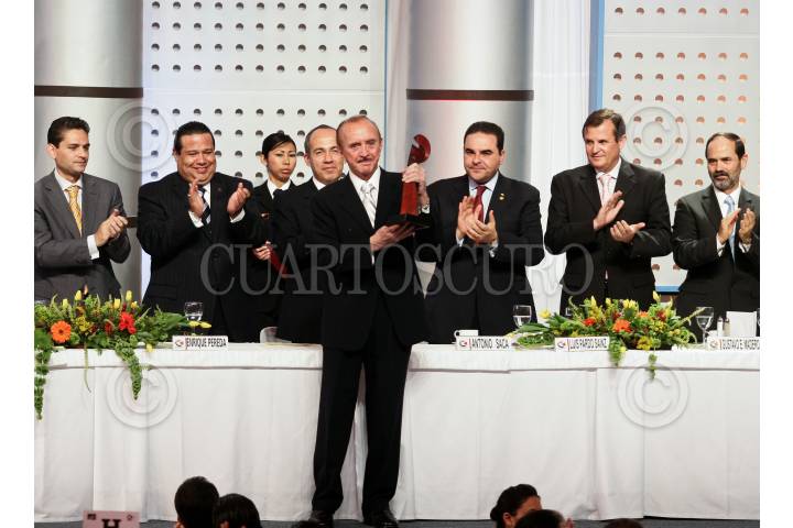 MÉXICO, D.F., 16OCTUBRE2008.- Luis de Llano Palmer fue galardonado durante la comida de la 50a Semana de la Radio y la Televisión, que encabezó el presidente de la CIRT, Enrique Pereda, y el presidente de México, Felipe Calderón Hinojosa. FOTO: ISAAC ESQUIVEL/CUARTOSCURO.COM