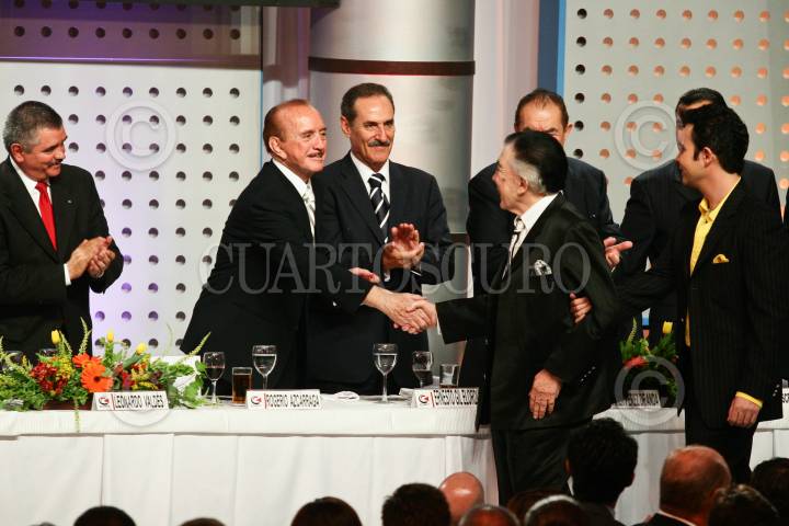 MÉXICO, D.F., 16OCTUBRE2008.- El compositor Roberto Cantoral saluda al presidente de Grupo Radio Fórmula, Rogerio Azcarraga, quienes fueron galardonados durante la comida de la 50a Semana de la Radio y la Televisión, que encabezó el presidente de la CIRT, Enrique Pereda, y el presidente de México, Felipe Calderón Hinojosa. FOTO: ISAAC ESQUIVEL/CUARTOSCURO.COM