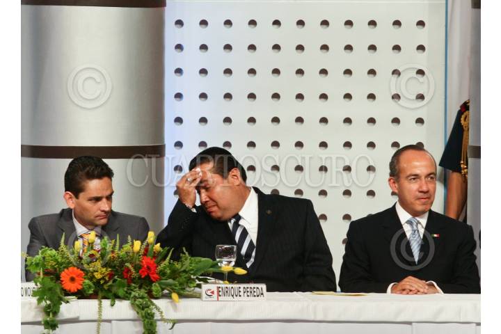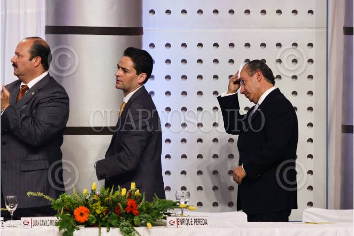 MÉXICO, D.F., 16OCTUBRE2008.- César Duarte, presidente de la Mesa Directiva de la Cámara de Diputados, Juan Camilo Mouriño, secretario de Gobernación, y Felipe Calderón Hinojosa, presidente de México, durante la comida de la 50a Semana de la Radio y la Televisión. FOTO: ISAAC ESQUIVEL/CUARTOSCURO.COM