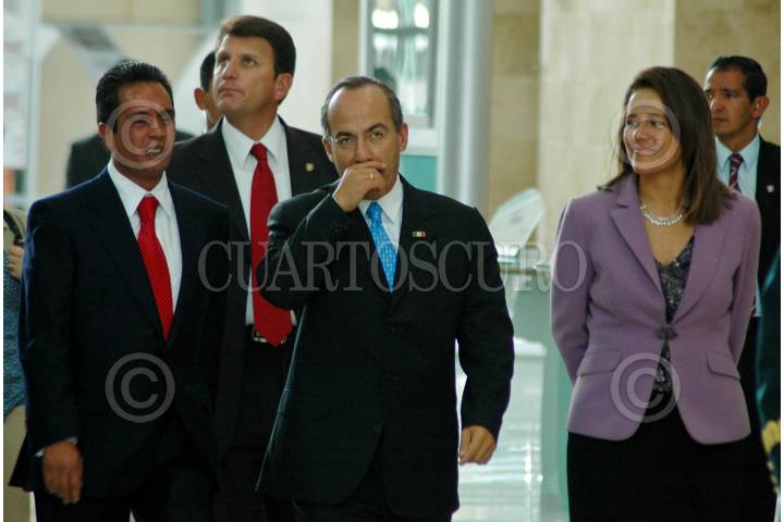 MÉXICO D.F., 24ABRIL2008.- El presidente Felipe Calderón Hinojosa, acompañado por Alejandro Puente Córdoba, presidente del Consejo Directivo de la Cámara Nacional de la Industria de Telecomunicaciones por Cable y la primera dama Margarita Zavala, a su llegada a la Inauguración de la Expo-Convención Canitec 2008. FOTO: RODOLFO ANGULO/CUARTOSCURO.COM