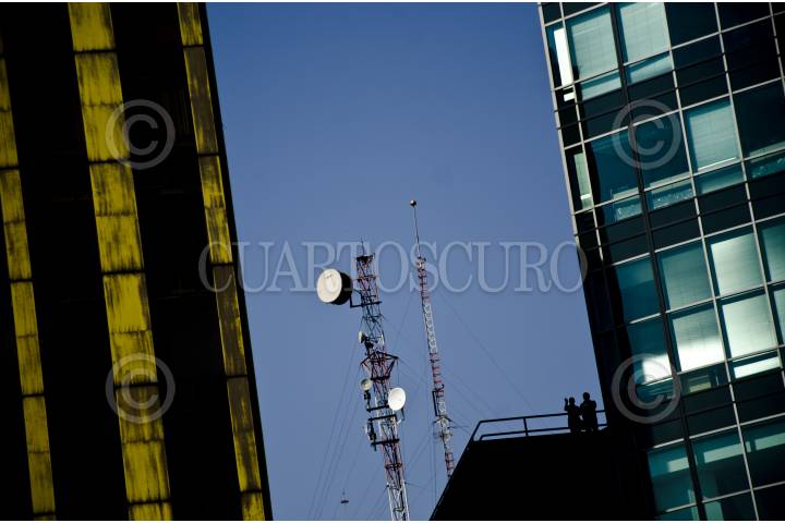 MÉXICO, D.F., 18ENERO2012.- Unas personas observan la ciudad desde la terraza de un edifico en avenida Paseo de la Reforma, detrás de ellos unas antenas de telecomunicaciones. FOTO: MISAEL VALTIERRA/CUARTOSCURO.COM