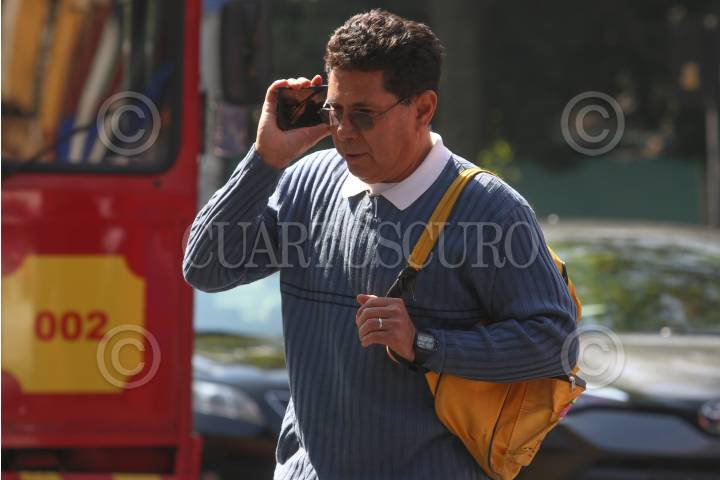 Un hombre pasa hablando con su celular a lado de una caseta telefónica.