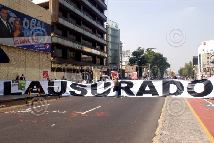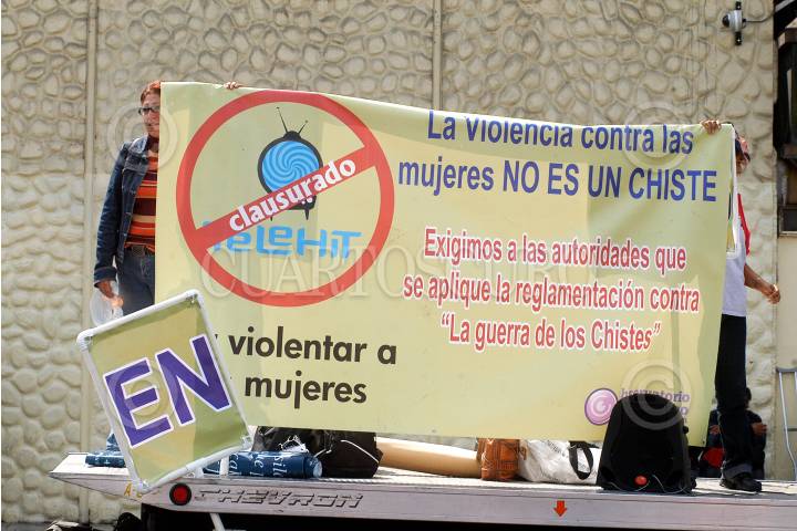 MÉXICO, D.F., 15OCTUBRE2009.- Integrantes de la asociación de los derechos contra las mujeres, se manifestaron frente a las instalaciones de la Empresa Televisa Chapultepec. En contra del programa Telehit en el que supuestamente humillan a las concursantes que asisten a este programa. Por lo que lo “Clausuraron“ simbólicamente. FOTO: LUIS CARBAYO/CUARTOSCURO.COM