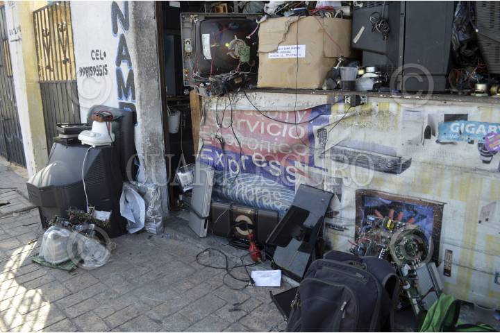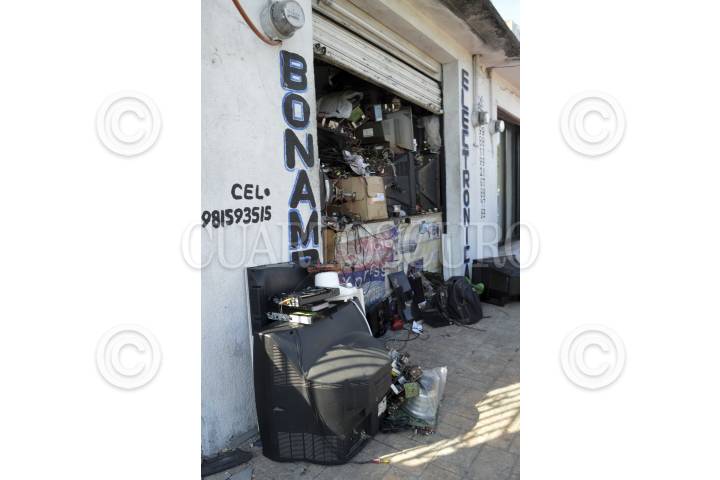 CANCUN, QROO., 11ENERO2015.- Julian Ake propietario de una tienda de reparación de aparatos electrónicas comenta que tiene televisiones y estéreos de mas de 2 años sin que la gente acuda por sus aparatos , sin que quepa una tele mas en su local, espera que el apagón analógico no lo afecte. FOTOS: ELIZABETH RUIZ /CUARTOSCURO.COM