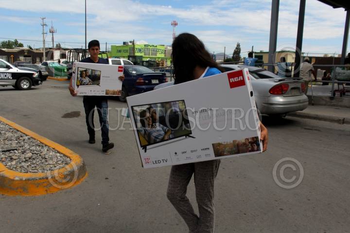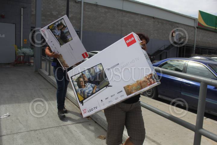 CIUDAD JUÁREZ, CHIHUAHUA,13JULIO2018.- La tienda de autoservico Bodega Aurrerá fue obligada por la Procuraduría Federal del Consumidor (Profeco) a cumplir con la venta de televisores a 3.29 pesos, tras etiquetarlos así por equivocación, 35 personas pagaron esa cantidad en la sucursal del Perimetral Carlos Amaya, tras aceptar vender los aparatos pero solo uno por familia. El acuerdo sólo incluyó las televisiones de 32 pulgadas, excluyendo a las de mayor tamaño cuyo precio fue indicado a 6 pesos; al mismo tiempo, anoche cuando surgió el caso, la empresa se protegió y cerró sus puertas para evitar que más gente entrara a tomar los televisores a precio de regalo. FOTO: NACHO RUÍZ /CUARTOSCURO.COM