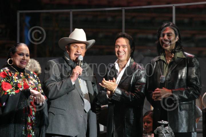 México, D.F. 01 OCTUBRE 2004.- Los temerarios felicitaron al "charro de México", Antonio Aguilar, por su gran trayectoria en el mundo de la música y el cine, durante el homenaje realizado en la Plaza de Toros México. FOTO: Sandra Perdomo/CUARTOSCURO.COM