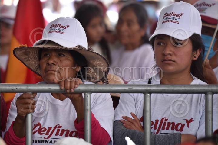 Dos mujeres durante el mitin de Delfina Gómez, candidata a la gubernatura del Estado de México, por la coalición “Juntos Hacemos Historia” conformada por los partidos políticos: Morena, PT y PVEM, en la explanada de la entidad.