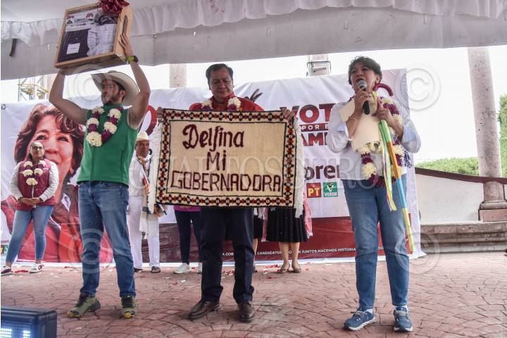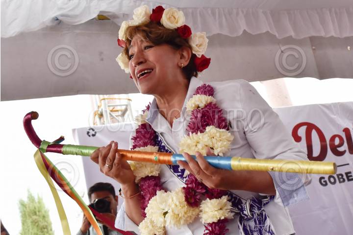 Delfina Gómez, candidata a la gubernatura del Estado de México, por la coalición “Juntos Hacemos Historia” conformada por los partidos políticos: Morena, PT y PVEM, durante su gira de campaña en la explanada de la entidad.