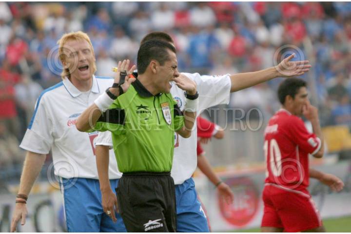 MEXDF16OCT2004.- El albitro marca un penalti inexistente cometido por Lussenhoff sobre Cardozo, durante el partido en donde Toluca venciò 3-1 al Cruz Azul en la fecha diez del Campeonato de Apertura 2004. FOTO: Eunice Adorno/CUARTOSCURO.COM