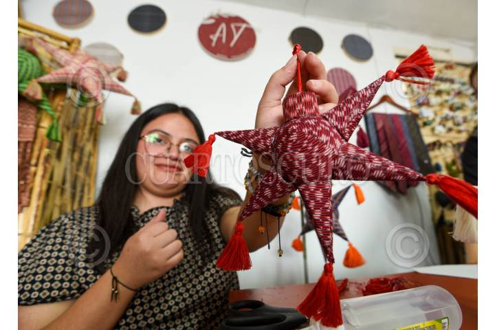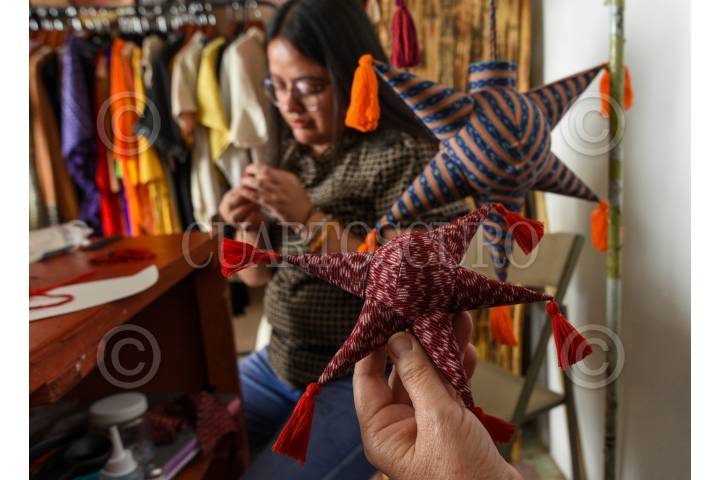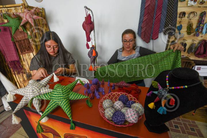 TENANCINGO, ESTADO DE MÉXICO, 05DICIEMBRE2023.- Ángeles Ortega, artesana de innovación en la rama de bisutería con rebozo y Yolanda Legarreta, innovadora en prendas de rebozo, originarias del municipio de Tenancingo forman parte del colectivo Arte Tenancingo, y como una forma de preservar el uso del rebozo en un objeto representativo en las fiestas decembrinas comenzaron a elaborar piñatas de rebozo, de diversos colores y tamaños, en una pieza en promedio tardan alrededor de dos horas y no sé desperdicia nada del rebozo ya que todo es utilizado para darle vida a otras prendas. Sus piñatas hasta el momento han sido enviadas a la CDMX, Ciudad Juárez, Monterrey y Querétaro, y esperan poder enviarlas a más lugares. Este municipio se caracteriza por sus rebozos y este colectivo en la búsqueda de preservar el uso del mismo ha innovado el portar esta prenda interviniendo otras prendas, así no se pierde el uso de los rebozos. El colectivo está formado por 9 artesanos y ofrecen desde mezcales de sabores, sales preparadas, Pan de Tecomatlán, prensas, licores, muebles de madera, artículos de piel, y 4 artesanas de innovación en rebozo se dedican a hacer bisutería, camisas, sombreros, bolsas, gorras entre otras cosas. Su tienda se encuentra a una cuadra del centro de Tenancingo y también los pueden encontrar en sus redes sociales. FOTO: CRISANTA ESPINOSA AGUILAR /CUARTOSCURO.COM