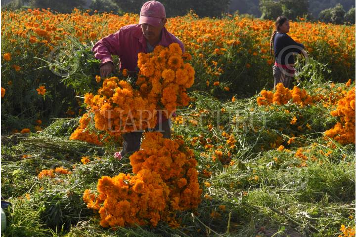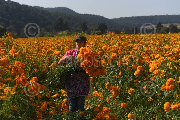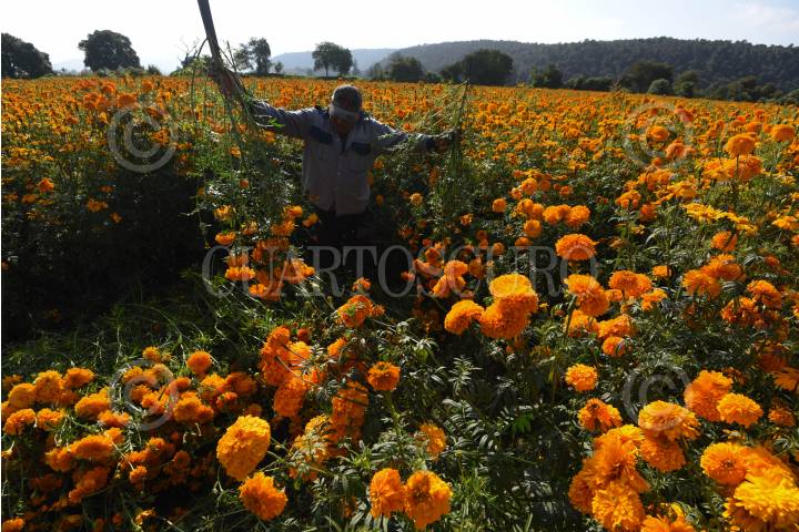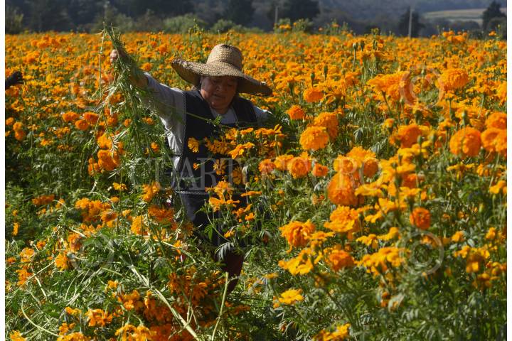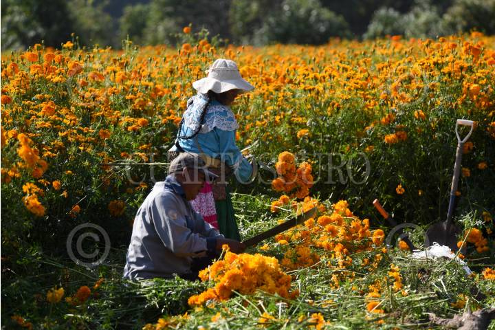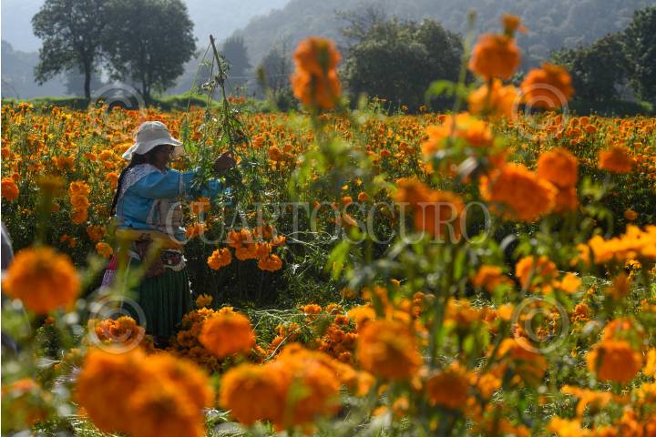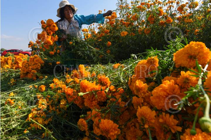 TENANGO DEL VALLE, ESTADO DE MÉXICO, 28OCTUBRE2024.- Mujeres y hombres desde muy temprana hora se encuentran trabajando en el corte de flor de cempasúchil en los campos de San Francisco Putla en el municipio de Tenango del Valle, que se viste de colores durante esta época; la flor de cempasúchil es un elemento esencial en la celebración de Día de Muertos, ya que viste y da color a las ofrendas que son instaladas en los hogares, y también se ha convertido en un ingrediente para la gastronomía mexicana. FOTO: CRISANTA ESPINOSA AGUILAR /CUARTOSCURO.COM