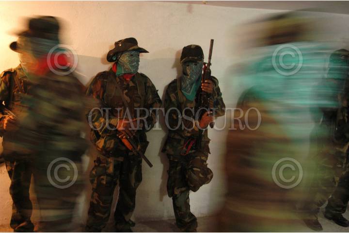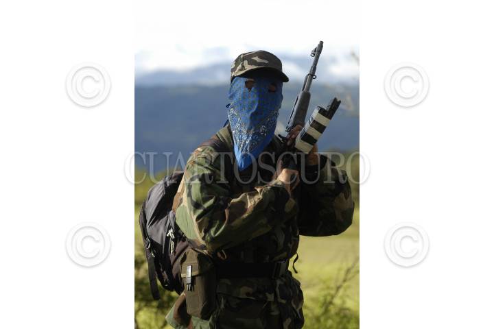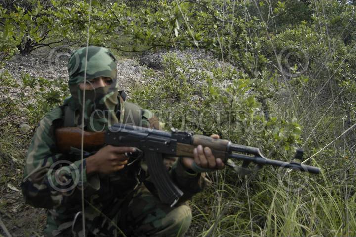 LUGAR DESCONOCIDO, 26 ENERO 2006.- Mas de una docena de integrantes del grupo armado guerrilero Tendencia Democrática Revolucionaria-Ejercito del Pueblo (TDR-EP) ofrecieron una conferencia de prensa para informar su decisión de establecer una tregua durante los meses de Enero y julio del 2006, comprometiendose así a no desarrollar ninguna acción político-militar. Asimismo expresaron su simpatía con la "Otra campaña" emprendida por el EZLN. Los guerrilleros portaban refles AK-47, R15 y M16. FOTO: Germàn Romero/CUARTOSCURO.COM