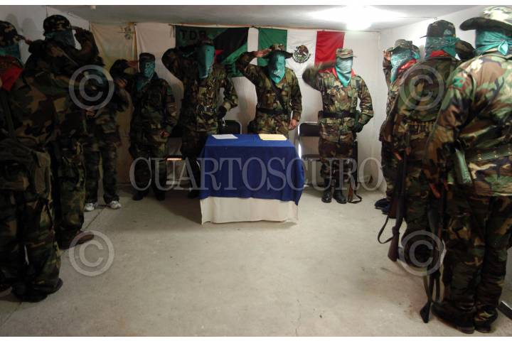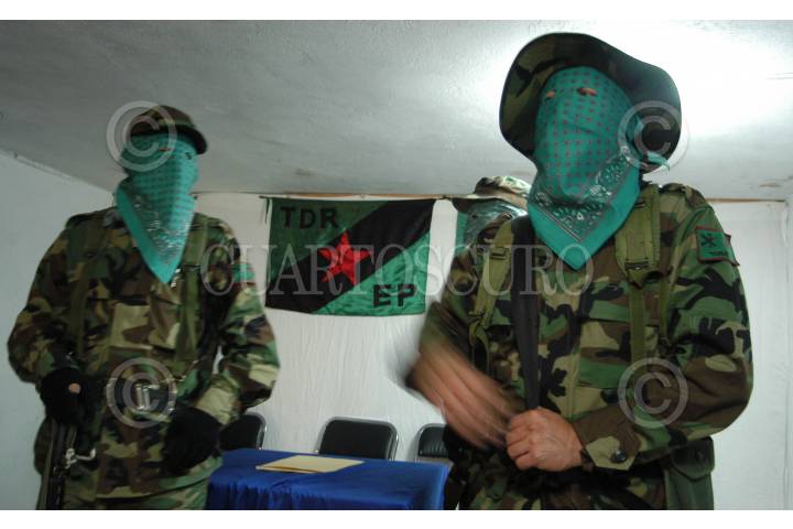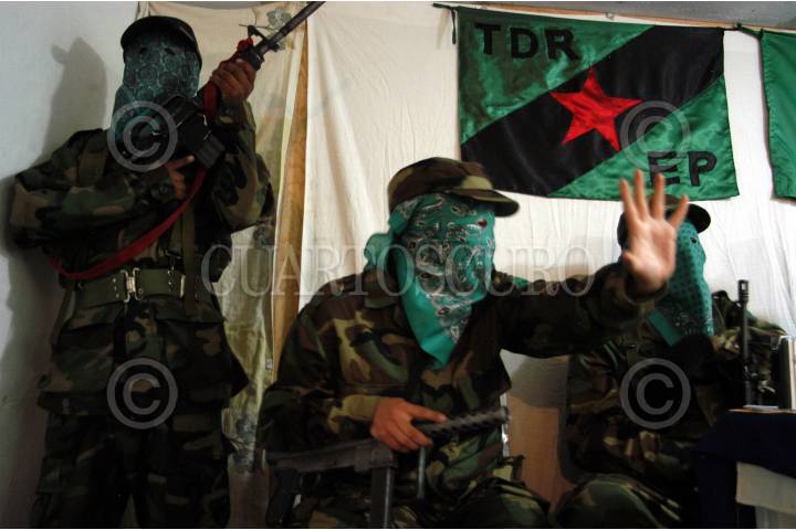 LUGAR DESCONOCIDO, 26 ENERO 2006.- Mas de una docena de integrantes del grupo armado guerrilero Tendencia Democrática Revolucionaria-Ejercito del Pueblo (TDR-EP) ofrecieron una conferencia de prensa para informar su decisión de establecer una tregua durante los meses de Enero y julio del 2006, comprometiendose así a no desarrollar ninguna acción político-militar. Asimismo expresaron su simpatía con la "Otra campaña" emprendida por el EZLN. Los combatientes Citlali, Vicente , José Arturo y Bolivar emitieron diversos comunicados. FOTO: Germàn Romero/CUARTOSCURO.COM