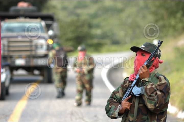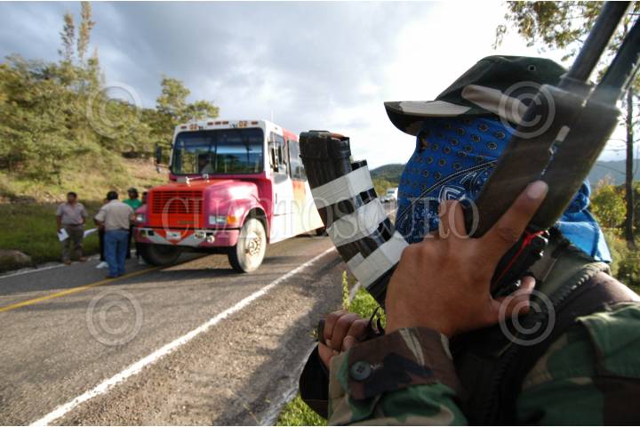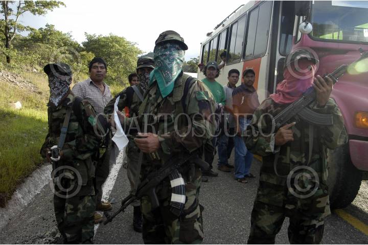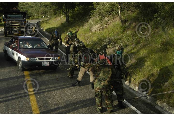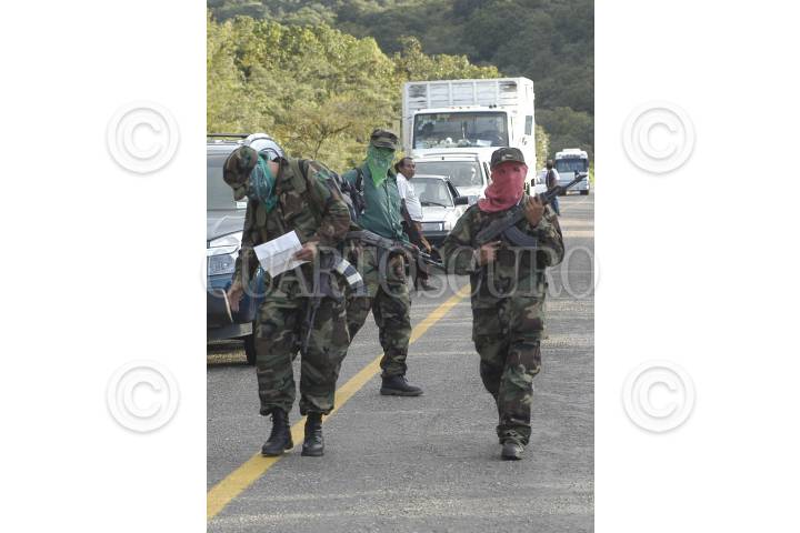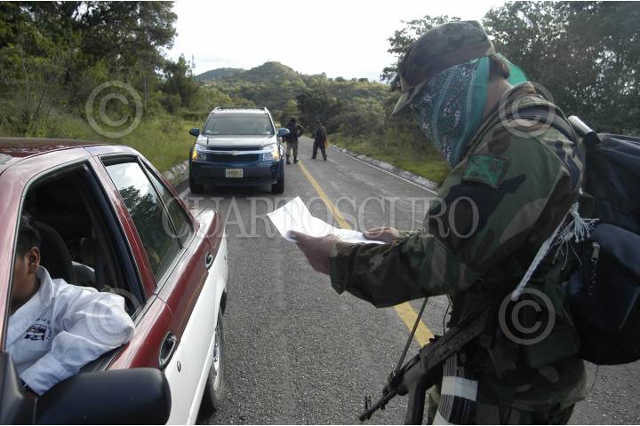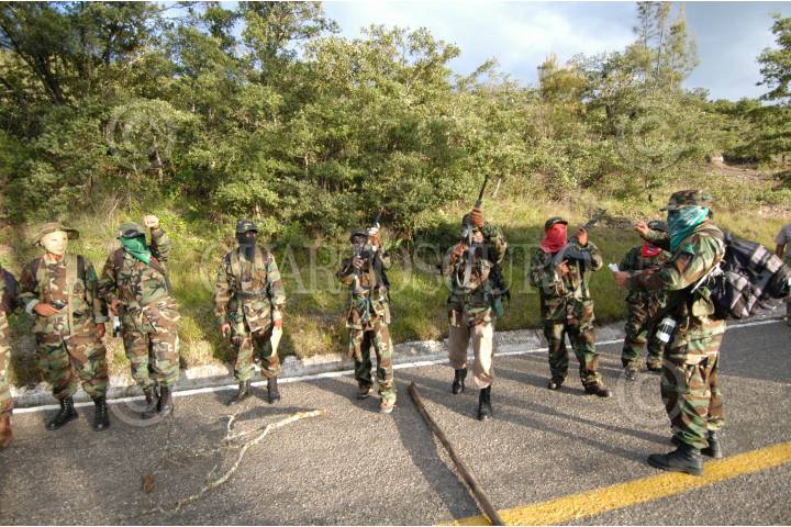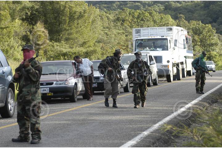OAXACA 31AGOSTO2006.- Una decena de integrantes del grupo insurgente armando Tendencia Democrática Revolucionaria-Ejército del Pueblo (TDR-EP) realizaron un bloqueo en la carretera Oaxaca-Guelatao para informar la necesidad de establecer un nuevo pacto social de tres puntos: 1.- Desconocer al gobierno espurio que de manera fraudulenta la ultraderecha ha decidido imponer, tal y como lo propone la convocatoria de la Convención Nacional Democrática por el Bien de Todos. 2.- Que contribuya a resolver el grave conflicto oaxaqueño mediante la desaparición de podes como lo exige la Asamblea Popular del Pueblo Oaxaqueño. 3.- Pide la liberación de los presos políticos del país como lo exige el EZLN. La TDR-ER rechaza su participación en el movimiento que realiza la Asamblea Popular del Pueblo Oaxaqueño. Las organizaciones revolucionarias armadas se mantendrán en estado de alerta para respuestas contundentes en caso de que las fuerzas de seguridad nacional pretendan intervenir en el conflicto magisterial. En la tarde ayer una decenas de personas armadas con rifles AK-47 bloquearon por 20 minutos la circulación de automóviles y repartieron información sobre su movimiento armado. Con esta acción los integrantes de la Tendencia Democrática Revolucionaria-Ejército del Pueblo (TDR-EP) recordaron la aparición del Ejercito Popular Revolucionario el 28 de agosto de 1996. Los uniformados no realizaron ningún disparo en señal de paz. FOTO: Carlos Guzmán/CUARTOSCURO.COM