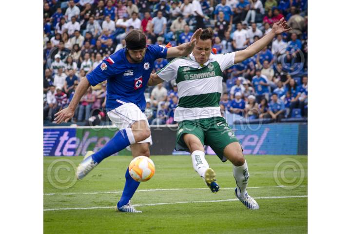 MÉXICO, D.F., 27ABRIL2013.- Mariano Pavone (Cruz Azul), intenta rematar durante el partido correspondiente a la jornada 16 del Torneo Clausura 2013 de la Liga MX entre el Cruz Azul vs Santos Laguna y llevado acabo en el estadio Azul. FOTO: MISAEL VALTIERRA / CUARTOSCURO.COM