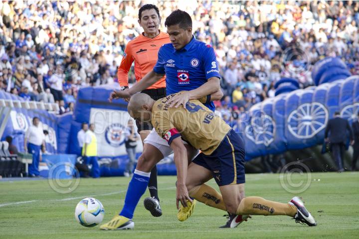 MÉXICO, D.F., 09FEBRERO2012.- El delantero cruzazulino Teofilo Gutiérrez se disputa un balón con el defensa puma Dario Verón, en partido correspondiente de la jornada 6 en el Estadio Azul. FOTO: MISAEL VALTIERRA / CUARTOSCURO.COM