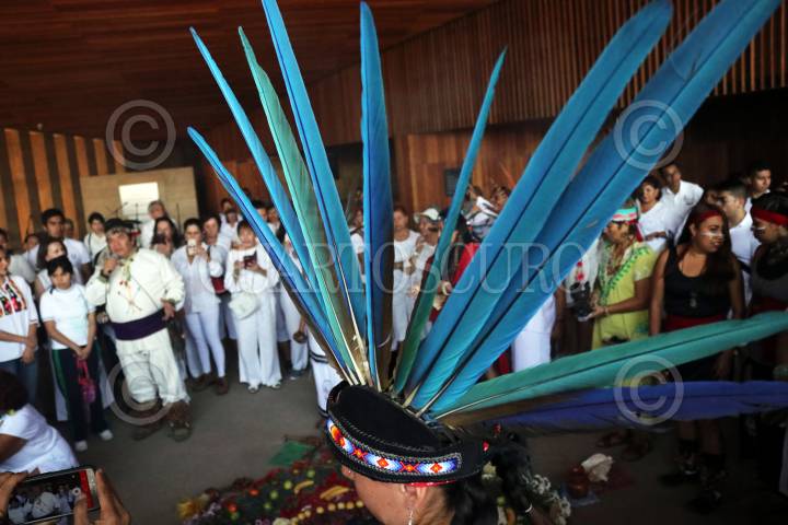 CUERNAVACA, MORELOS, 21MARZO2019.- El penacho de una mujer danzante durante la celebración por la entrada de la primavera en el auditorio Teopanzolco, a lado de la zona arqueológica del mismo nombre que se encuentra cerrada desde el 19 de septiembre del 201 7, cuando fue dañada por el sismo. FOTO: MARGARITO PÉREZ RETANA /CUARTOSCURO.COM