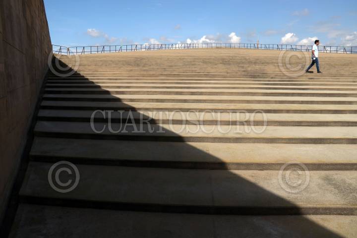 Un hombre camina por el Auditorio Teopanzolco en la mañana de este día.