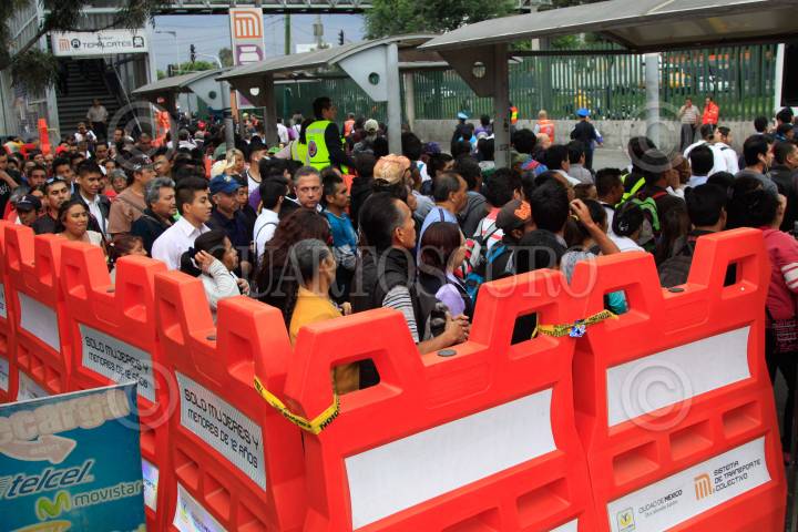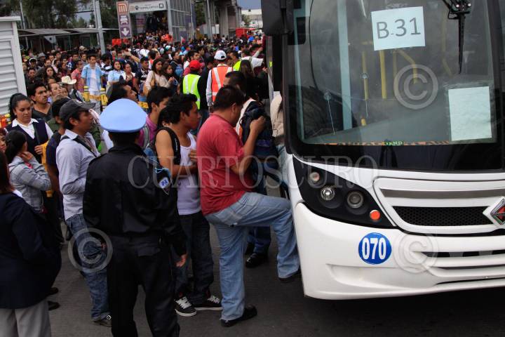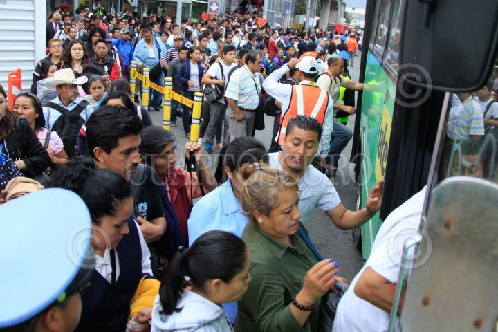 MÉXICO, D.F., 15JUNIO2015.- Largas filas y molestias por pasajeros de la linea A del Sistema de Transporte Colectivo Metro, se observa en el paradero de la estación Tepalcates debido a la insuficiente demanda de camiones para transportar a usuarios que descienden del metro y abordan unidades del RTP que se dirigen al paradero de La Paz. FOTO: SAÚL LÓPEZ /CUARTOSCURO.COM