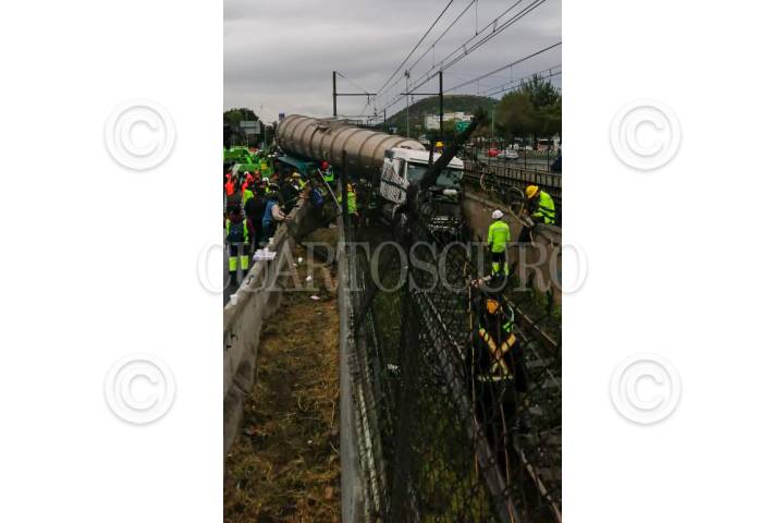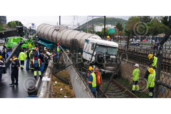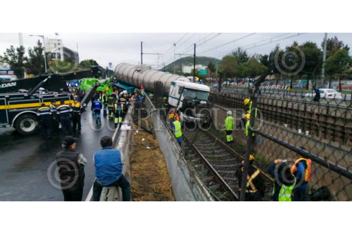 CIUDAD DE MÉXICO, 29SEPTIEMBRE2019.- Un trailer que circulaba sobre avenida Zaragoza perrito el control lo que provocó que se metiera a las vías del metro de la la Línea A, a la altura de Tepalcates dirección centro. FOTO: ARMANDO MONROY /CUARTOSCURO.COM