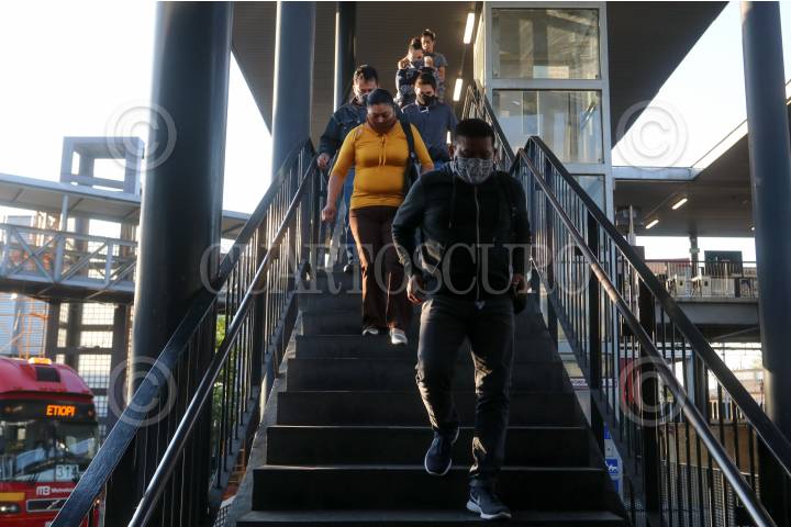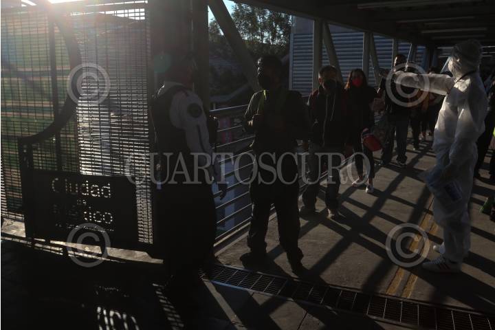 Trabajadores del Sistema de Transporte Público Metrobús realizaron la dosificación del ingreso de usuarios en la estación terminal Tepalcates con el propósito de no propagar más contagios de Covid-19 y evitar aglomeraciones