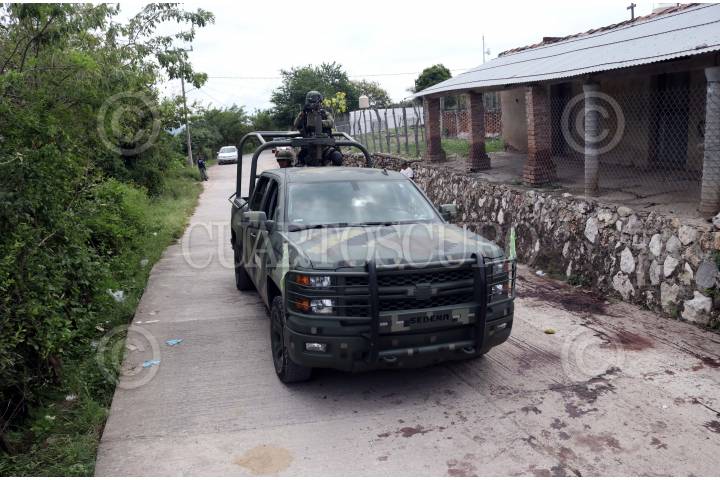 IGUALA DE LA INDEPENDENCIA, GUERRERO, 16OCTUBRE2019.- Sitio donde la tarde de ayer elementos militares se enfrentaron con un grupo armado en la comunidad de Tepochica al sur de la ciudad. Según información oficial los militares realizaban acciones de reconocimiento en la zona cuando se toparon de frente con hombres armados que se trasladaban en camionetas los cuales los atacaron. Catorce civiles y un militar murieron en el enfrentamiento. De acuerdo con las autoridades fueron asegurados tres vehículos, 13 armas largas, seis armas cortas, una granada de mano, municiones y cargadores. Los cuerpos de los catorce civiles permanecen en una funeraria que ofrece el Servicio Médico Forense. En la imagen el sitio donde quedaron grandes manchas de sangre, cartuchos percutidos y material que se usó durante el levantamiento de los cadáveres. FOTO: MARGARITO PÉREZ RETANA /CUARTOSCURO.COM