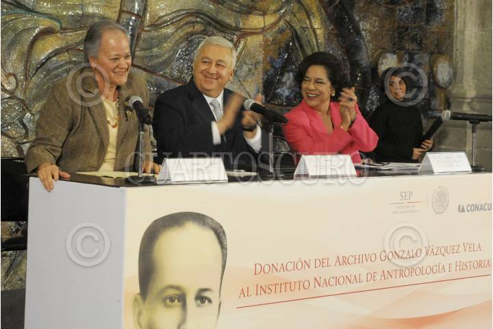 MÉXICO, D.F., 04FEBRERO2014.- En la SEP se realizó la donación del archivo Gonzalo Vázquez Vela al Instituto Nacional de Antropología e Historia, en el Salón Nizhizawa de la Secretaria de Educación Pública (SEP). En imagen Carmen Vázquez, Emilio Chuayffet y Teresa Franco. FOTO: ARTURO LÓPEZ /CUARTOSCURO.COM