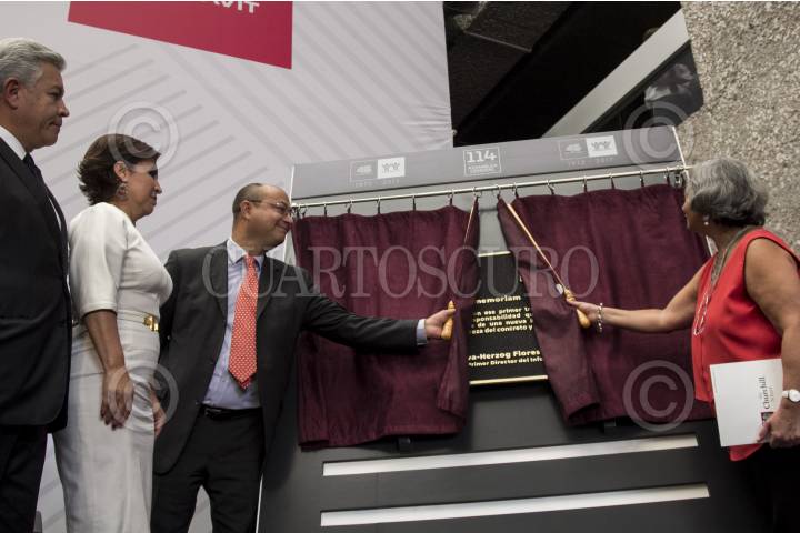 CIUDAD DE MÉXICO, 03MAYO2017.- David Penchyna, director del INFONAVIT; Rosario Robles, titular de la Secretaría de Desarrollo Agrario, Territorial y Urbano (Sedatu); Jesús Silva-Herzog Márquez, hijo del fallecido Jesús Silva-Herzog, primer director del organismo, y Teresa Silva-Herzog Márquez, hija del mismo, durante la 114 asamblea del organismo, así como la conmemoración de su 45 aniversario. Durante el acto se habló del importante papel que desempeño Silva-Herzog al frente de la institución y las acciones que hasta la fecha se continúan para el beneficio de los trabajadores. En la imagen, momento de la debelación de la placa conmemorativa para el primer director del organismo. FOTO: GALO CAÑAS /CUARTOSCURO.COM
