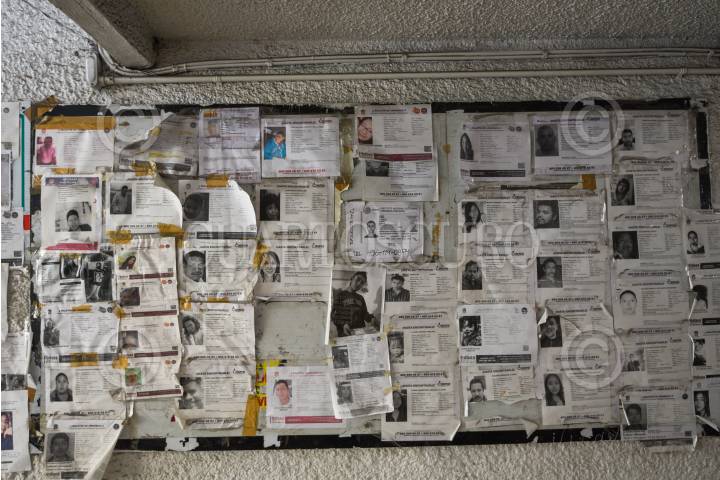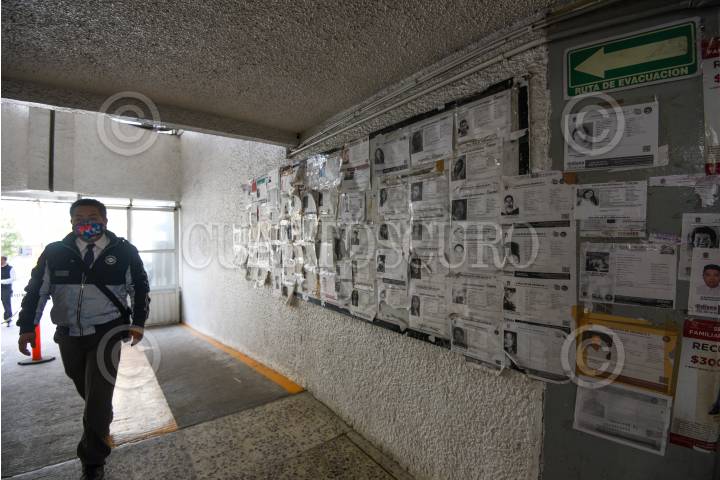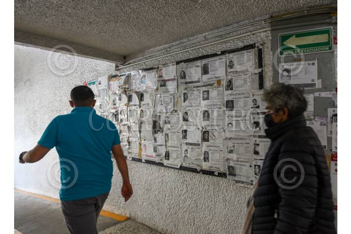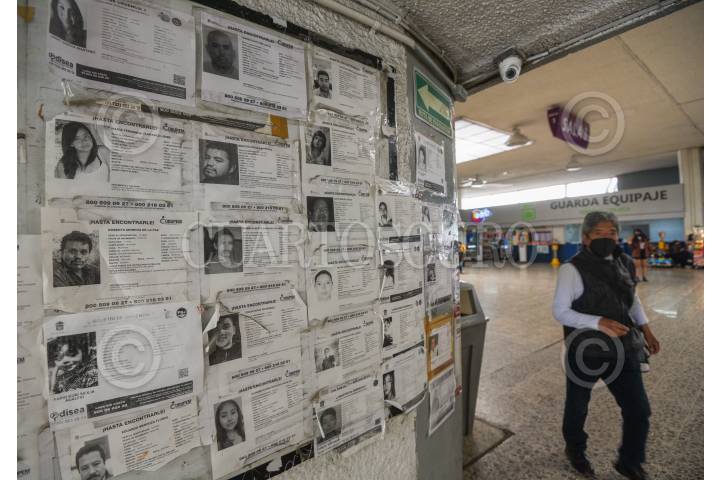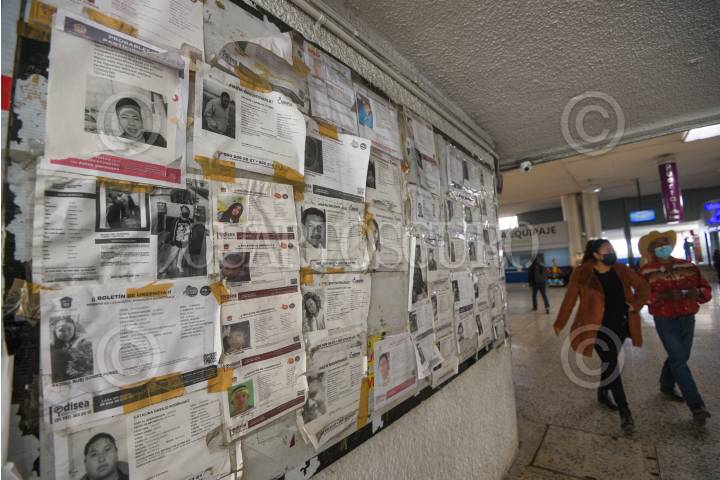 Usuarios de la Terminal de Autobuses de Toluca observan las fichas de búsqueda de personas desaparecidas pegadas en uno de los accesos de la terminal.