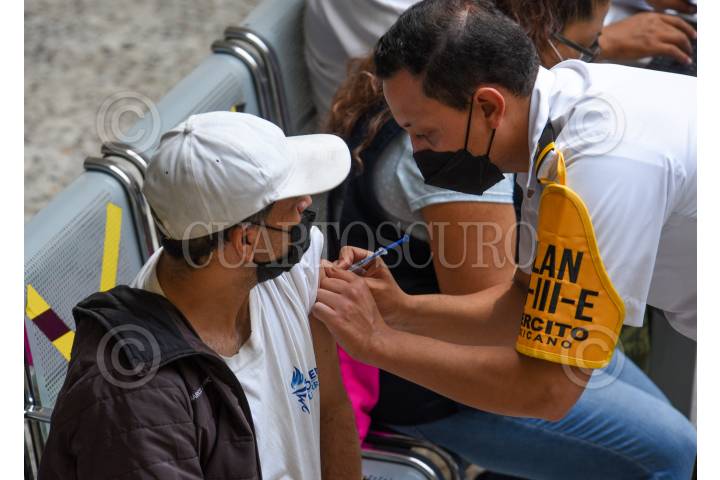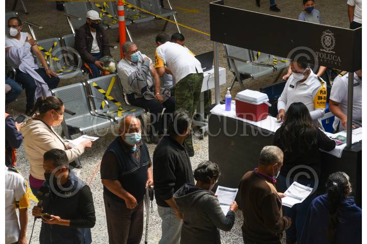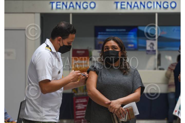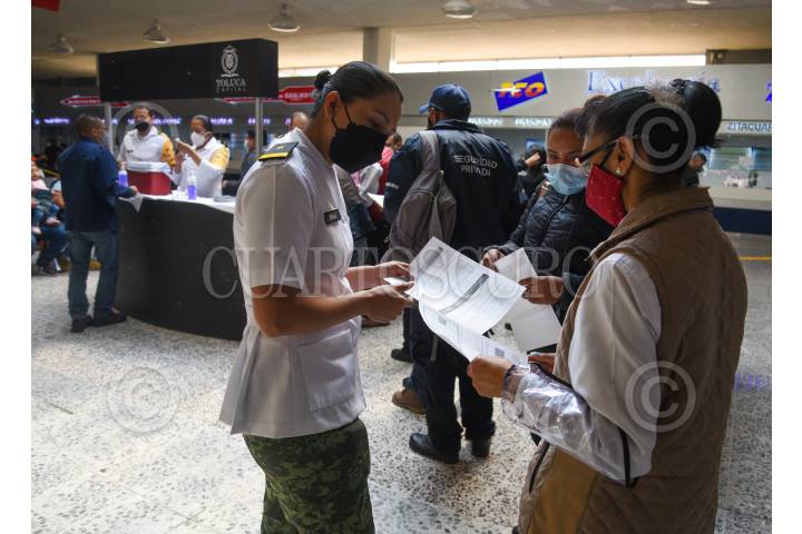 Personal del Hospital de la 22 Zona Militar instalaron un módulo de vacunación contra COVID-19 en la Terminal de Autobuses de Toluca aplicado el biológico de AstraZeneca a mayores de 18 años de edad.