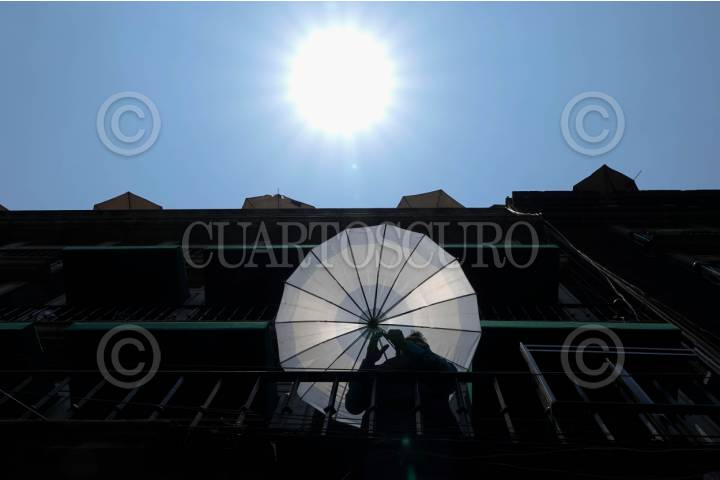 CIUDAD DE MÉXICO, 01MAYO2024.- Un trabajador de las terrazas del Zócalo invita a gente que transita por la plancha a pasar a su restaurante durante un día de intenso calor. FOTO: GALO CAÑAS/CUARTOSCURO.COM