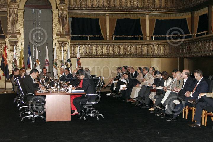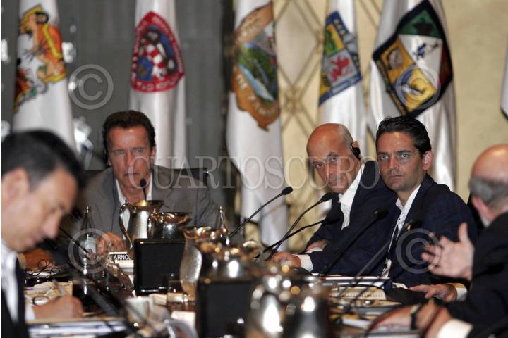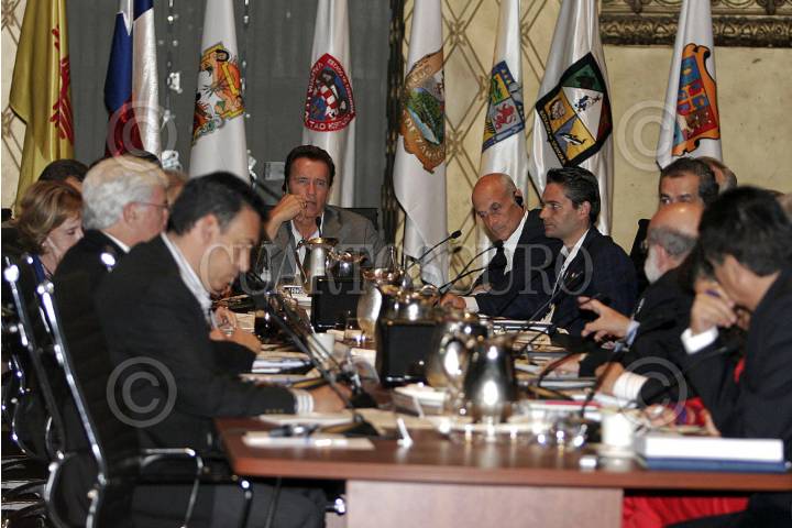 LOS ANGELES, CALIFORNIA, ESTADOS UNIDOS.- El Secretario de Gobernación, Juan Camilo Mouriño Terrazo, participó en la “ Mesa de debate y trabajo de los Gobernadores Fronterizos, con los Secretarios de Estado”, en el marco de la XXVI Conferencia de Gobernadores Fronterizos, realizada en la ciudad de Los Ángeles, California. Además de los gobernadores fronterizos de los estados de Baja California, José Guadalupe Osuna Millán; de California, Arnold Schwarzenegger; de Coahuila, Humberto Moreira Valdés; de Nuevo León, José Natividad González; de Sonora, Eduardo Bours y de Texas, Rick Perry; participaron el Secretario de Seguridad Interna de Estados Unidos, Michael Chertoff; el Secretario del Departamento del Interior, Dirk Kempthorne y el Secretario de Medio Ambiente y Recursos Naturales de México, Juan Rafael Elvira. FOTO:SANTIAGO IRIGOYEN/CUARTOSCURO.COM