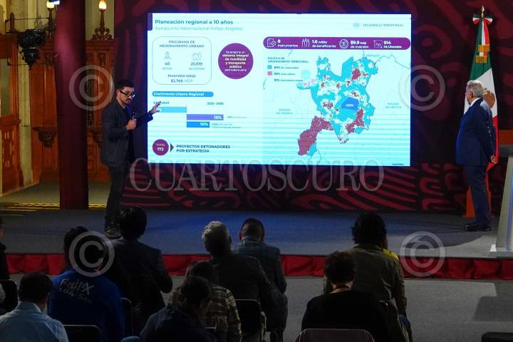 CIUDAD DE MÉXICO, 11JULIO2024.- Andrés Manuel López Obrador, presidente de México y Román Meyer Falcón, titular de la Secretario de Secretaría de Desarrollo Agrario, Territorial y Urbano, durante la conferencia matutina, esto desde el Salón Tesorería de Palacio Nacional. FOTO: ROGELIO MORALES /CUARTOSCURO.COM