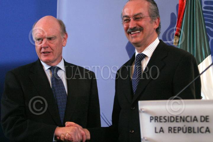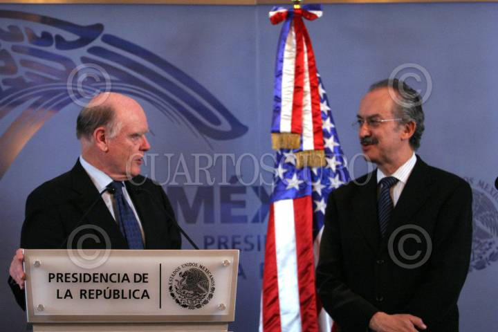 MEXICO, D.F. 15DICIEMBRE2005.- John Snow, secretario del Tesoro de Estados Unidos y Francisco Gil Díaz, secretario de Hacienda y Crredito Público durante una conferencia de prensa que ofrecieron a los medios de comunicación. FOTO: Nelly Salas/CUARTOSCURO.COM