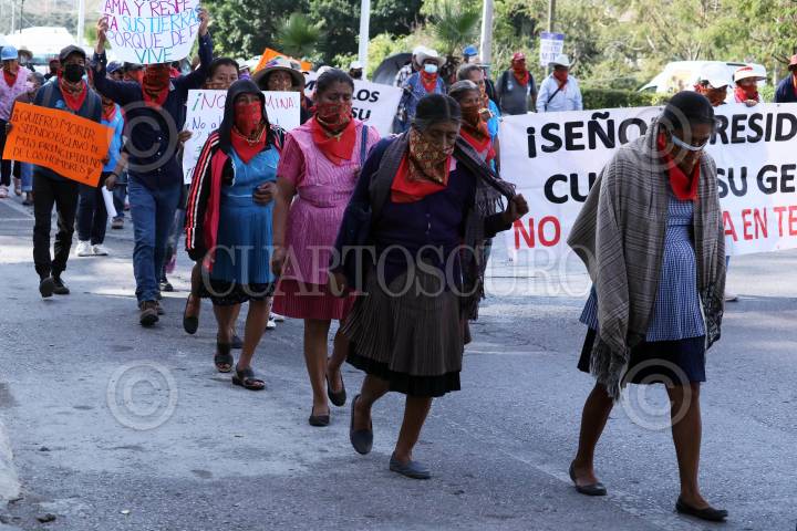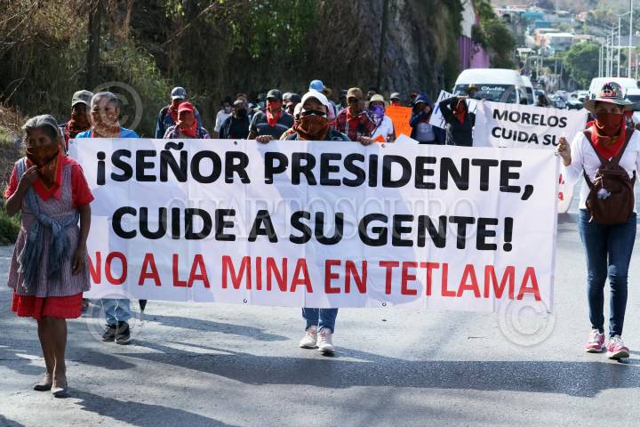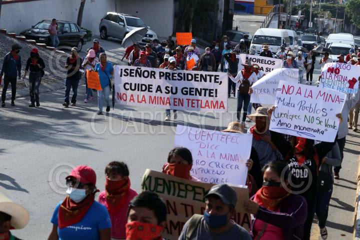 Indigenas de Cuentepec y Tetlama marchan para exigir que Temixco sea declarado municipio libre de concesiones mineras.