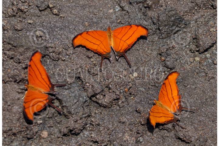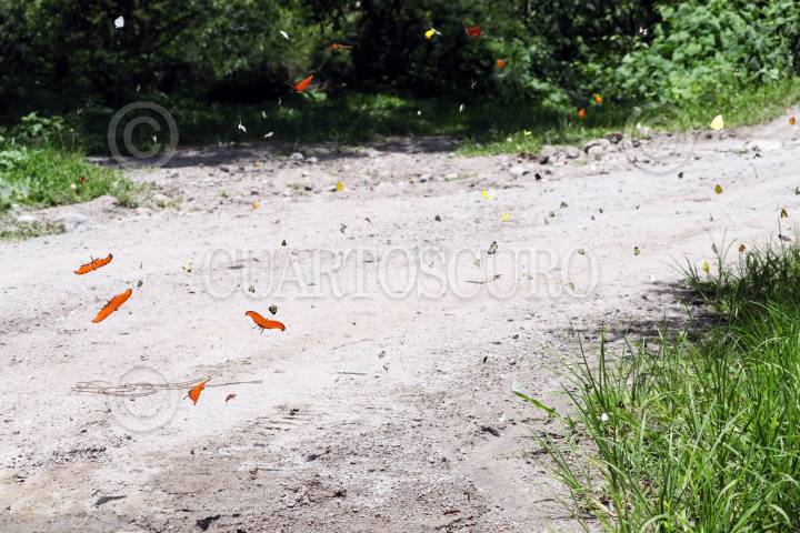 Mariposas anaranjadas con líneas negras abren sus alas al sol del mediodía en una cañada de la comunidad de Tetlama, al poniente del estado de Morelos.