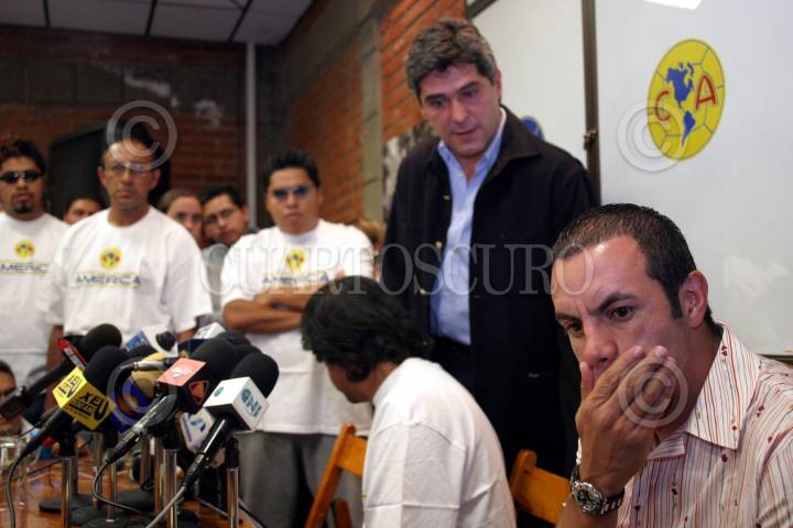 México, D.F., 14MAYO2004.- Cuauhtémoc Blanco, delantero del América, Javier Pérez Teuffer, presidente del club Aguila y representantes de las barras de apoyo, se disculparon por la bronca en la Libertadores y anunciaron las sanciones a integrantes del equipo y la desaparición de la llamada porra monumental y la creación de la Nación Azul y Crema. FOTO: Moisés Pablo/CUARTOSCURO.COM