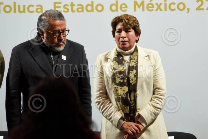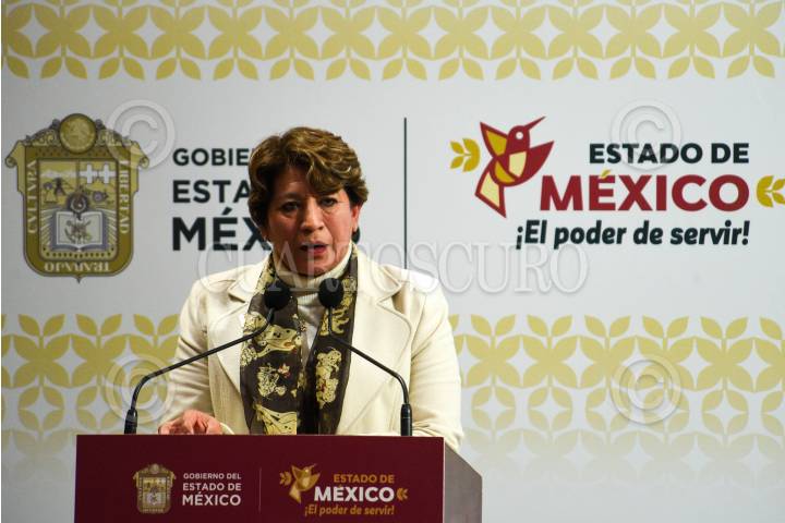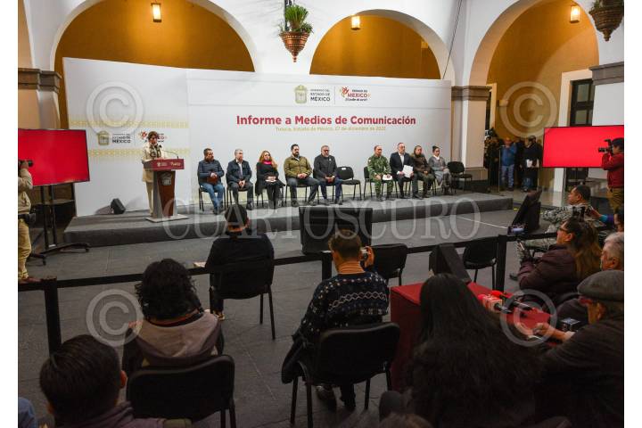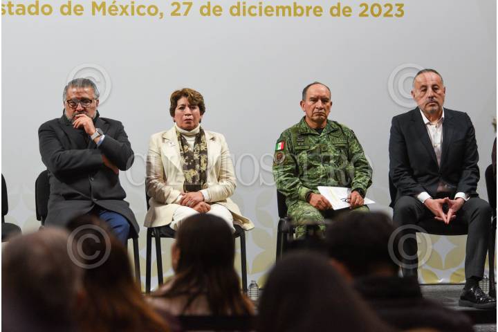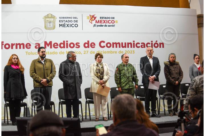 TOLUCA, ESTADO DE MÉXICO, 27DICIEMBRE2023.- Delfina Gómez Álvarez Gobernadora del Estado de México encabezó el informe a medios sobre el seguimiento del caso Texcaltitlán, acompañada de Andrés Andrade Téllez, Secretario de Seguridad Estatal, José Luis Cervantes Martínez, Fiscal General de Justicia del Estado de México, Horacio Duarte Secretario General de Gobierno; por su parte la FGJEM informó que quedan exentos de acción penal los pobladores que participaron en el enfrentamiento en Texcapilla, y sobre las 14 personas desaparecidas ya fue emitida su ficha de búsqueda, se continúan con las investigaciones y se ofrece recompensa a quien dé informes sobre su paradero. También se informaron sobre las acciones en torno a Salud, Educación, Bienestar, Campo y DIFEM. FOTO: CRISANTA ESPINOSA AGUILAR /CUARTOSCURO.COM