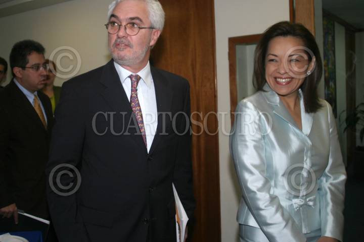 MEXICO, D.F. 18ABRIL2005.- Josefina Vazquez Mota, secretaria de desarrollo social y Therry Lemaresquier, coordinador de sistemas de la ONU previo a dar a conocer los resultados de Los Objetivos de Desarrollo del Milenio en México, Avance 2005. FOTO: Nelly Salas/CUARTOSCURO.COM
