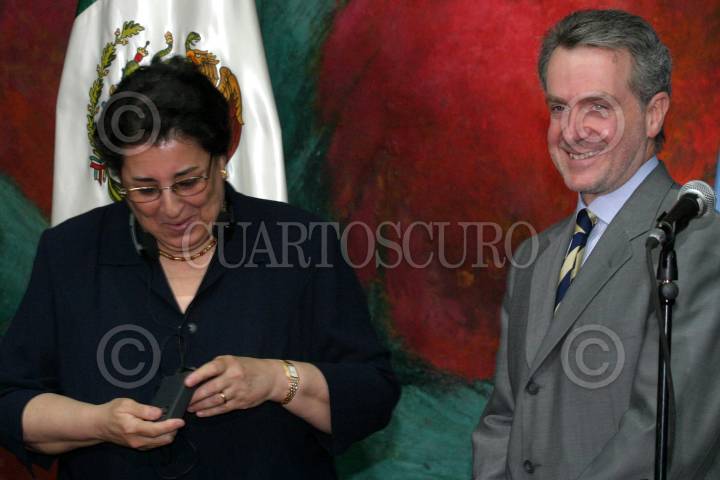 México, D.F. 04 MAYO 2004.- Thoraya Obaid, directora ejecutiva del fondo de la Poblacion de las Naciones Unidas y Santiago Creel Miranda, secretario de Gobernación, al iniciar la conferencia dfe prensa al término del Foro, realizado en el auditorio Jaime Torres Bodet en el Museo de Antropología. FOTO: Sandra Perdomo/CUARTOSCURO.COM