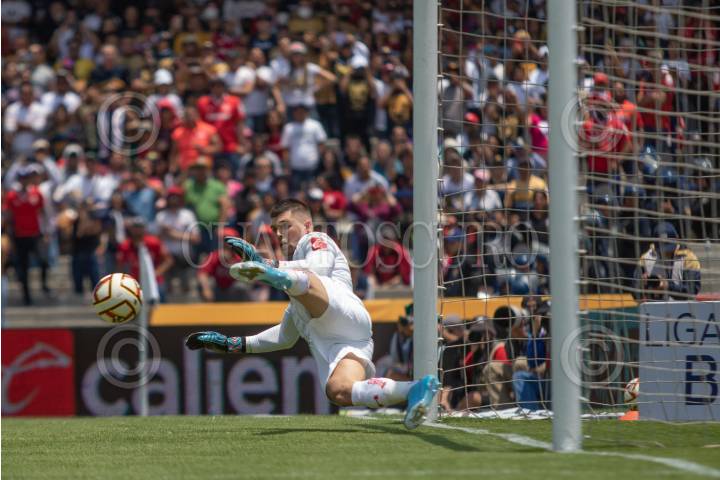 Tiago Volpi, portero del Toluca, nada pudo hacer en el tiro penal cobrado por Eduardo Salvio de los Pumas.
