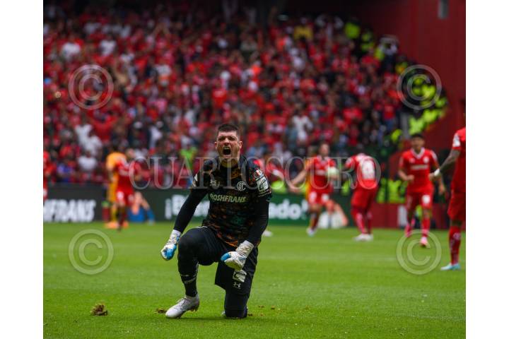 TOLUCA, ESTADO DE MÉXICO, 08OCTUBRE2023.- Tiago Volpi portero de los Diablos de Toluca festeja su anotación ante Gallos Blancos de Querétaro en la cancha del Nemesio Diez, como parte de la jornada 12 del Torneo Apertura 2023 de la Liga MX, lográndose imponer la escuadra escarlata con un marcador final 3-1. FOTO: CRISANTA ESPINOSA AGUILAR /CUARTOSCURO.COM