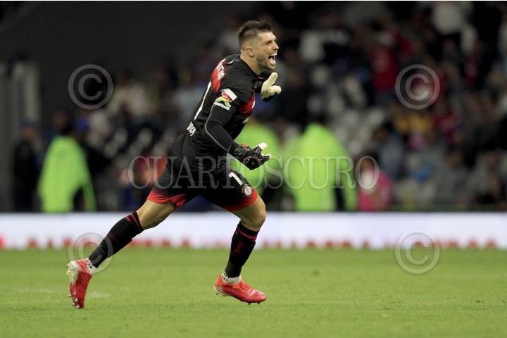 Tiago Volpi portero de los Diablos de Toluca festeja la anotación ante los Rayados de Monterrey durante el encuentro en el Nemesio Diez.