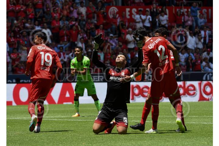 Tíago Volpi portero de los Diablos Toluca festeja una anotación ante los Rayados del Necaxa, durante el encuentro en el estadio Nemesio Diez.