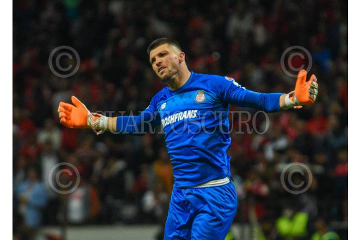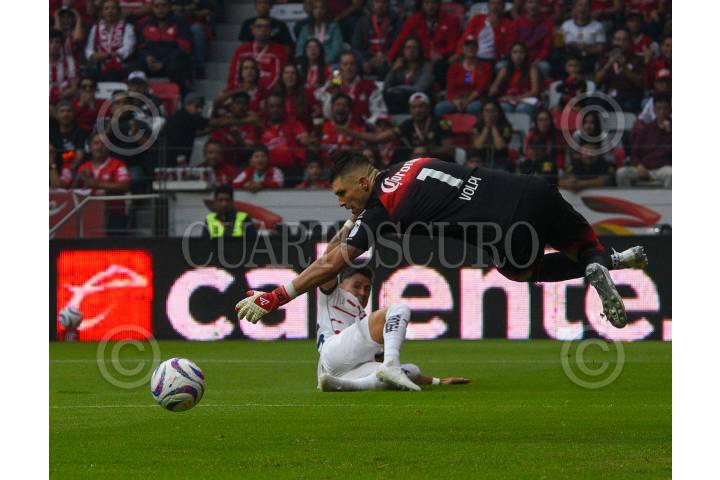 Milton Giménez delantero de los Rayos del Necaxa y Tiago Volpi portero de los Diablos de Toluca durante la jornada 5 de la Copa Sky.