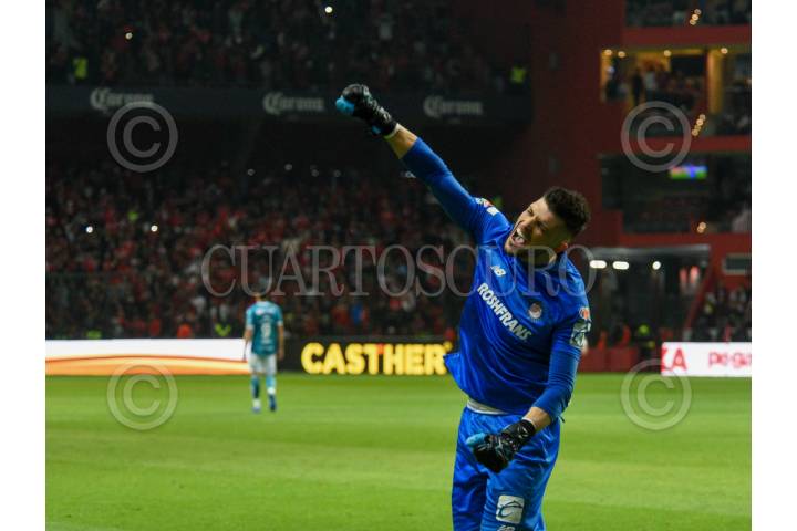 Tiago Volpi portero de los Diablos del Toluca festeja una de las anotaciones ante escuadra de Tigres, quienes consiguieron su pase a semifinales, con un marcador global ante Diablos 5-4 en el estadio Nemesio Diez.